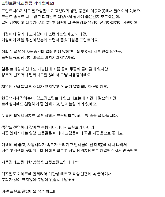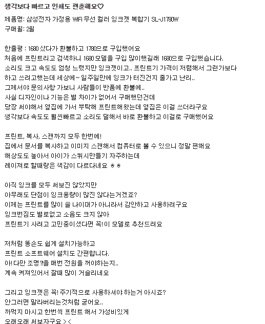 - 삼성 SL-J1680: "설치가 간편하고 인쇄 품질이 우수합니다."