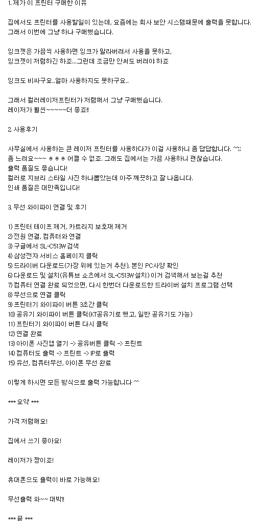- 삼성 SL-C513W: "컬러 인쇄 속도가 빠르고 선명합니다."