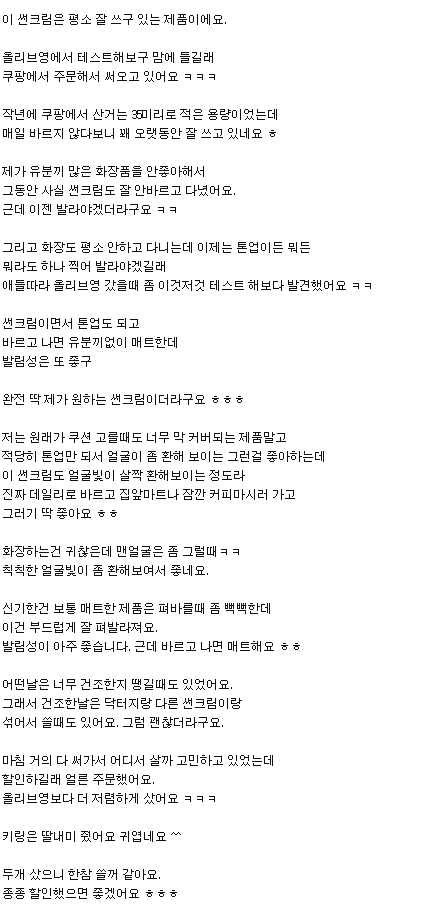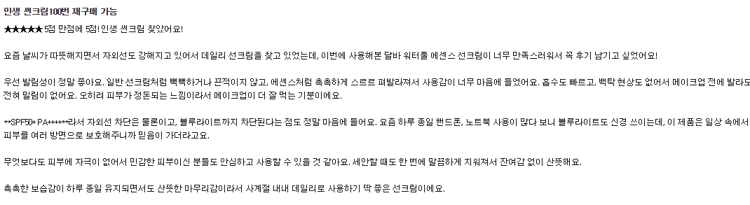 | 달바 워터풀 선크림 | 수분 에센스 타입 | 촉촉하고 흡수 빠름 | 여름엔 다소 무거움 |