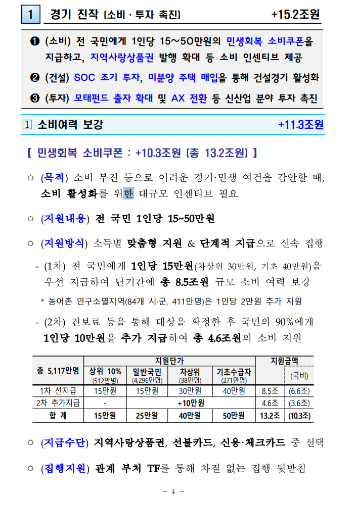 이번 2차 추가경정예산안에 따라 전국민에게 지급되는 민생회복 소비 쿠폰은 계층별로 차등 지급됩니다. 정부는 “소득 수준과 지역 특성을 고려한 맞춤형 지원”이라는 점을 강조했는데요. 공문 기준으로 보았을 때 지원 대상자는 다음과 같이 분류됩니다: