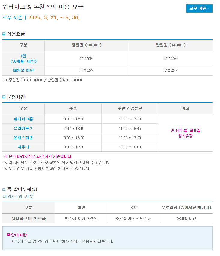 - 입장 전 날씨 확인 필수! 우천 시 운영 중단 시설이 있을 수 있습니다.