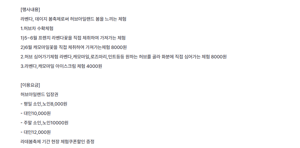 | 허브아일랜드 라데봄 | 5.1 ~ 6.30 | 포천시 신북면 | 성인 10~12천원 | 라벤더+데이지, 체험 풍성 |